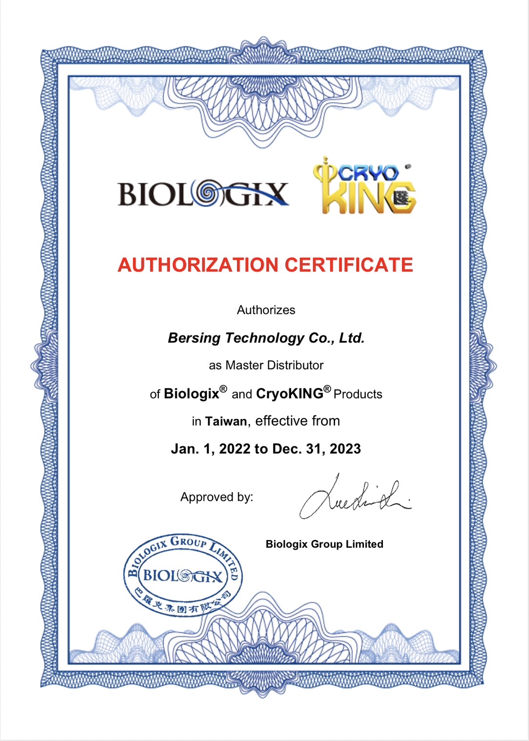 Biologix & CryoKING授權證書 | 伯新科技股份有限公司