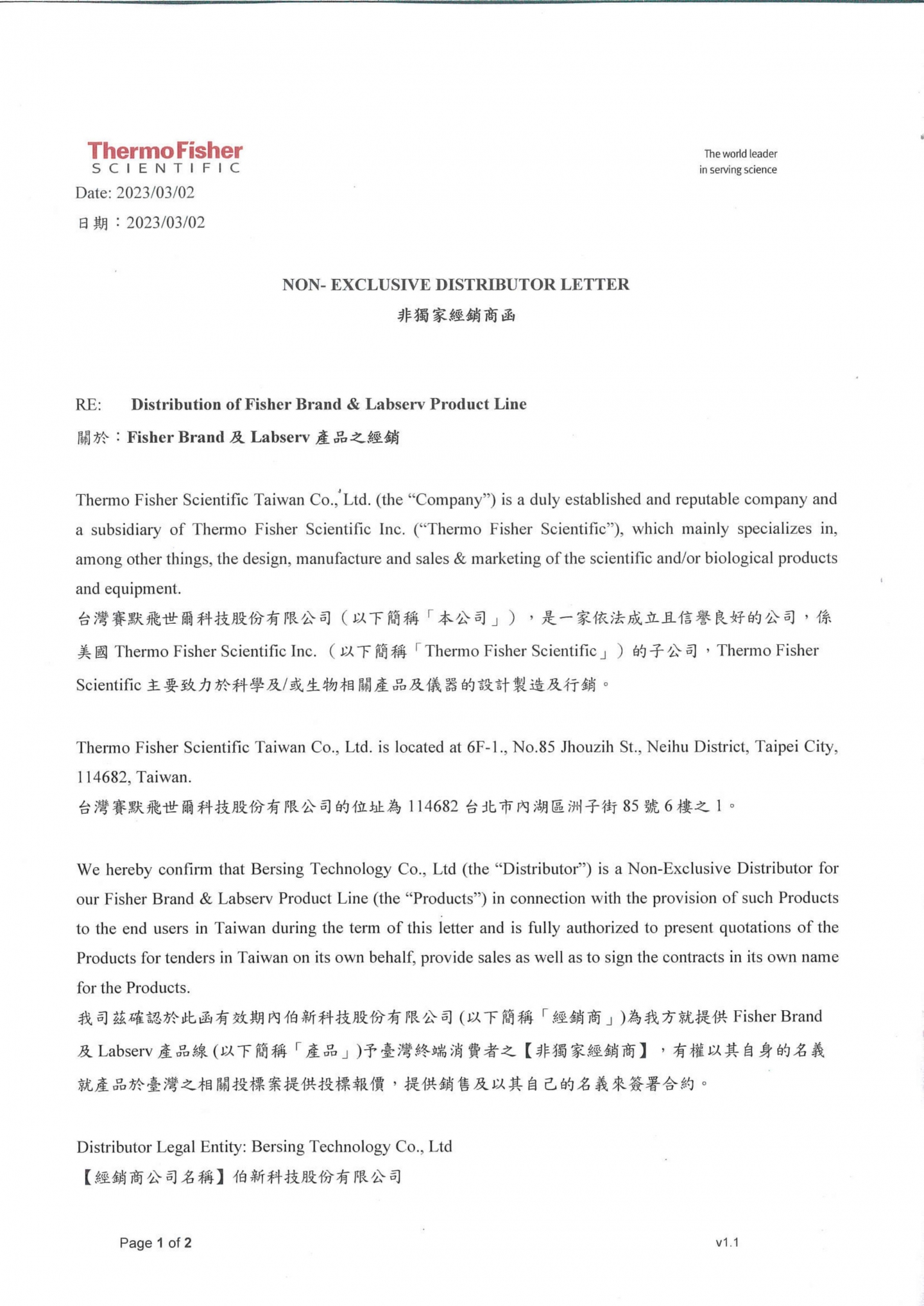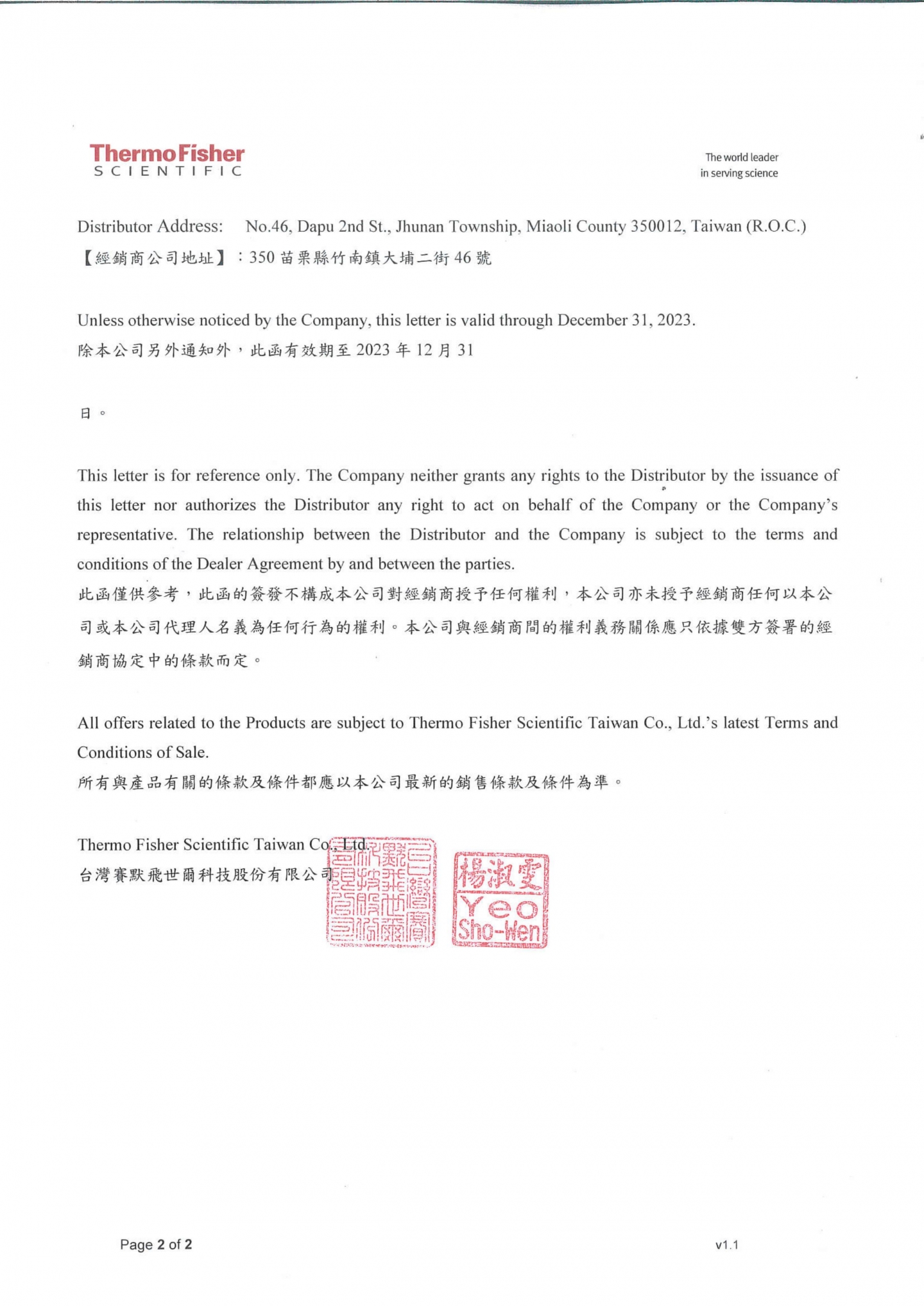 Thermo Fisher 2023經銷代理證 | 伯新科技股份有限公司
