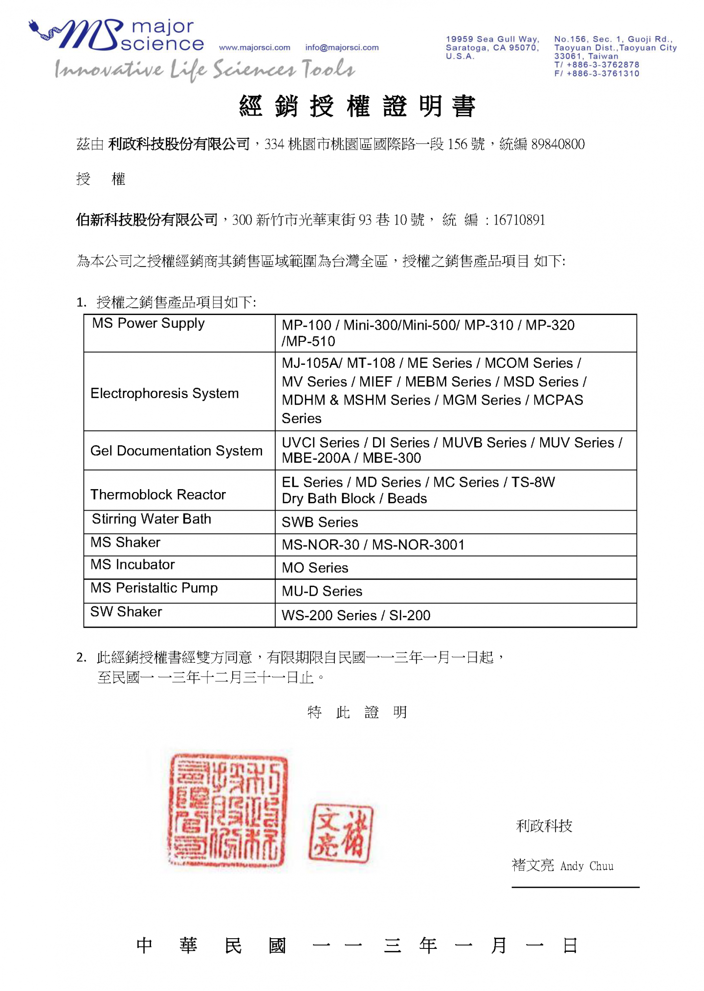 2024 MS major science經銷授權證明書 | 伯新科技股份有限公司