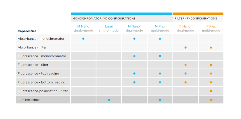 - 偵測功能:吸收光、螢光 (上下方)、時差性螢光(內建)、螢光偏極光、冷光、雙色冷光