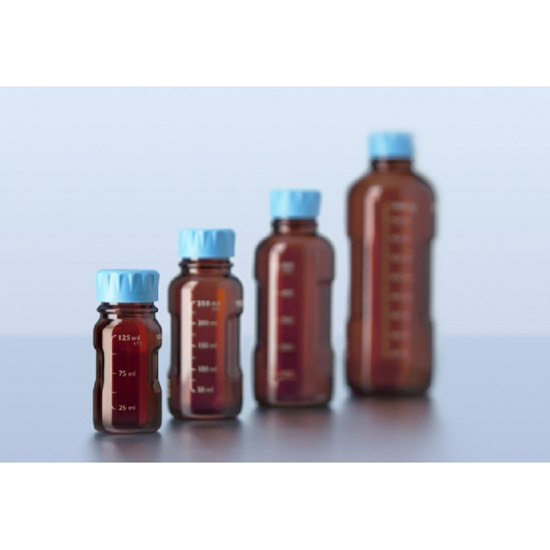 DURAN®附刻度,附GL45青綠色PP螺旋蓋及內環- 高硼矽製玻璃瓶,瓶身凹型設計符合人體工學,方便握取。